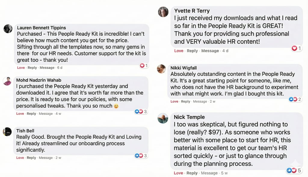 With the People Ready Kit Essentials, you’ll get proven templates, checklists, scripts, and plug-and-play tools that make running your team dramatically easier.